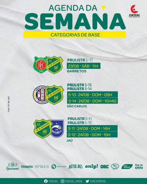As categorias de base do Esporte Clube XV de Novembro de Jaú têm compromissos importantes neste fim de semana pelo Campeonato Paulista. Os jovens atletas das equipes Sub-11, Sub-12, Sub-13, Sub-14 e Sub-17 se preparam para representar o clube em partidas decisivas, com jogos marcados em Jaú, São Carlos e Barretos.