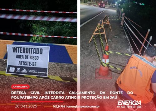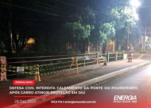 A Defesa Civil de Jaú interditou parte do calçamento da chamada Ponte do Poupatempo, que liga a região central à Avenida Dr. Quinzinho, após um veículo atingir a proteção lateral da estrutura. O caso foi registrado na madrugada deste domingo (28).
