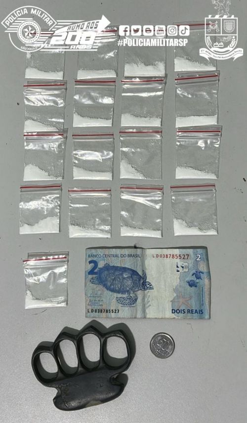 Durante patrulhamento intensificado na Avenida Santa Catarina, policiais militares abordaram um homem que apresentava comportamento suspeito. Na busca pessoal, foram encontrados 17 sacos plásticos contendo cocaína, totalizando 14,88 gramas, além de R$ 2,50 e um aparelho celular da marca Motorola.
