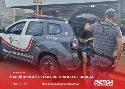 A Polícia Militar prendeu um homem e uma mulher por tráfico de drogas em Itapuí. Durante patrulhamento no bairro São Rafael, os policiais abordaram uma motocicleta ocupada pelos dois suspeitos, já conhecidos nos meios policiais.