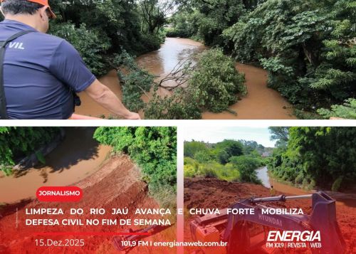 Os trabalhos de limpeza e manutenção do Rio Jaú seguem em andamento em diversos pontos do município. As ações são realizadas por meio de parceria entre a Prefeitura de Jaú e o Governo do Estado de São Paulo, por intermédio da agência SP Águas, com acompanhamento da Defesa Civil.