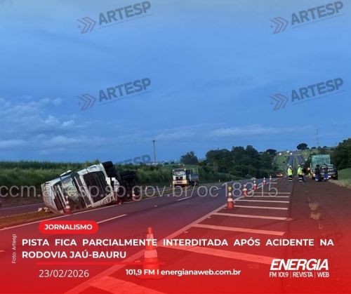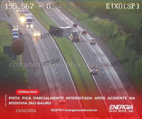 Um caminhão tombou no quilômetro 195 da rodovia Jaú-Bauru, em Itapuí, na madrugada desta segunda-feira (23).
