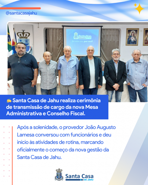 A Irmandade de Misericórdia do Jahu realizou na manhã desta quarta-feira (01), a cerimônia interna de transmissão de cargo da nova mesa administrativa e do conselho fiscal da Santa Casa de Jahu. Os eleitos no dia 25 de setembro assumem mandato até 30 de abril de 2026.