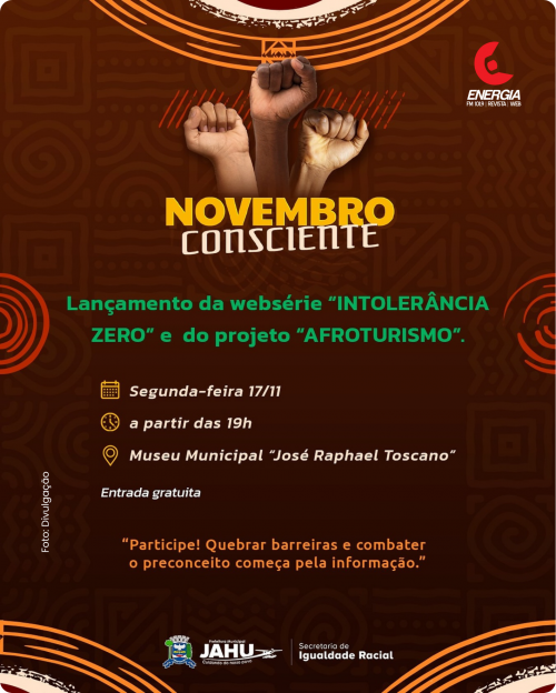 Como parte da programação da campanha “Novembro Consciente”, será realizado nesta segunda-feira (17), às 19h, no Museu Municipal José Raphael Toscano, o lançamento da websérie Intolerância Zero e do projeto AfroTurismo.